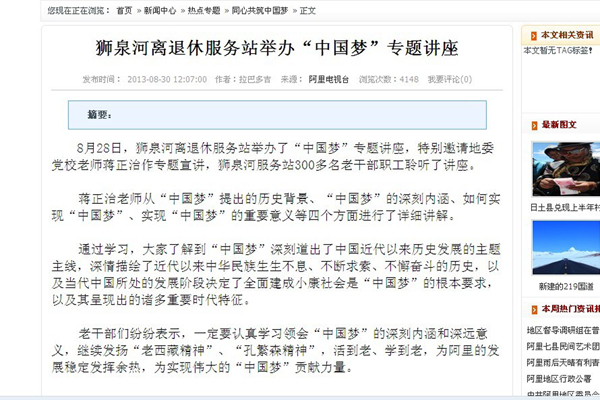 根據(jù)安排,蔣正治還將在阿里地區(qū)老干局、阿里地區(qū)公安處、阿里軍分區(qū)等單位宣講“中國夢”。