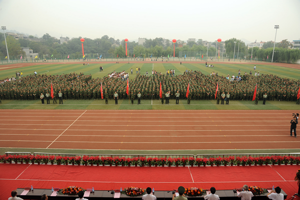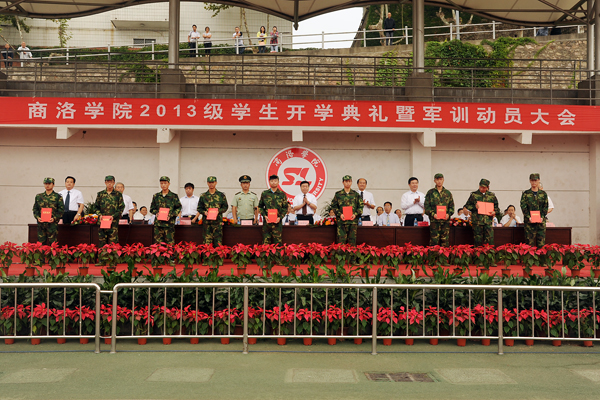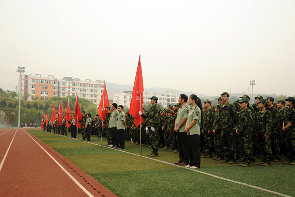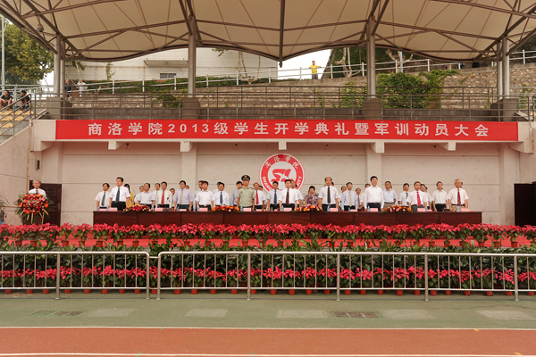 秋高氣爽、丹桂飄香,9月7日上午,我校隆重舉行2013級新生開學(xué)典禮暨軍訓(xùn)動(dòng)員大會(huì)。校領(lǐng)導(dǎo)張景書、劉建林、左曉民、王思懷、陳永莊、魏書堂.武警商洛支隊(duì)參謀長向軍,商洛供電局副局長趙紅強(qiáng),商洛聯(lián)通副總經(jīng)理陳安民出席了大會(huì)。校黨委書記張景書向承訓(xùn)教官授2013級學(xué)生軍訓(xùn)團(tuán)團(tuán)旗,黨委副書記、校長劉建林做了重要講話。大會(huì)由黨委副書記左曉民主持。各系部黨政負(fù)責(zé)人、各職能部門負(fù)責(zé)人與來自全國27個(gè)?。ㄊ?、自治區(qū))的3000余名2013級新生參加了大會(huì)。
