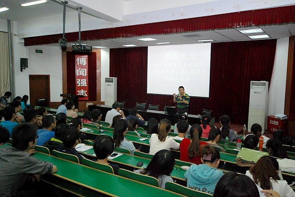 在報告會上,楊季芳從師資情況、科研項目、培訓特色等方面向我校學生介紹了生環(huán)學院的基本情況和2014年工程碩士(生物工程領(lǐng)域)招生簡介。他說,生環(huán)學院的主要培養(yǎng)方向為水生生物物質(zhì)工程和海洋牧場、海洋生物資源與生物制品、食品化學與安全控制等三方面,具有良好的就業(yè)前景。希望我校學子明確考研目標,端正考研態(tài)度,積極報告浙江萬里學院生環(huán)學院。
