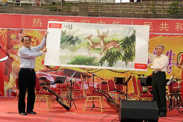 西安音樂學(xué)院黨委副書記、副院長(zhǎng)孫衛(wèi)國(guó),商洛市政府副秘書長(zhǎng)劉仲林,校黨委書記張景書,黨委副書記、院長(zhǎng)劉建林,黨委副書記左曉民,紀(jì)委書記王思懷,副院長(zhǎng)陳永莊、魏書堂,商洛市教育局工會(huì)主席許丹莉,商洛聯(lián)通公司總經(jīng)理溫長(zhǎng)山,各系部、各職能部門黨政負(fù)責(zé)人和2013級(jí)全體新生一起觀看了演出。演出開始前,左曉民代表我校向西安音樂學(xué)院贈(zèng)送了我校藝術(shù)系主任劉鳳林創(chuàng)作的《吉祥雙鹿圖》,象征兩校之間友誼長(zhǎng)存。