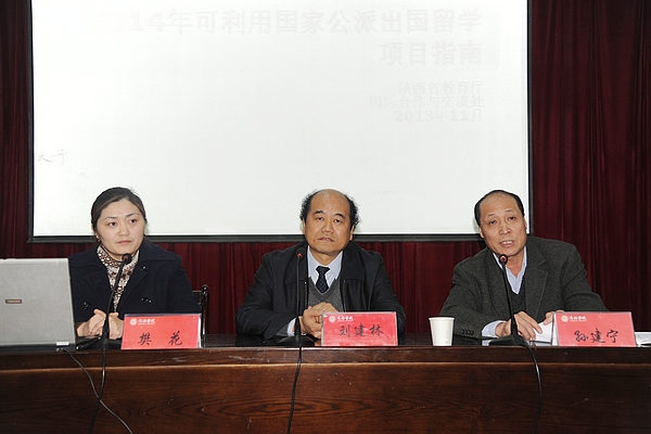 2014年國家公派出國留學項目已于今年10月啟動,為了幫助我校教師深入了解該項目的相關政策與具體申請要求,推進我校教師對出國留學項目的有效利用,進一步加快我校高層次人才隊伍建設,11月27日,陜西省教育廳國際合作與交流處處長孫建寧,國際合作與交流處國家公派出國留學項目負責人、西安外國語大學國際合作與交流處老師樊花應邀來到我校,對該項目進行了詳細講解說明。院長劉建林出席會議并作了講話,各系(部)主任、全校碩士研究生以上學歷教職工參加會議。會議由校干部人事處、外事辦公室聯(lián)合舉辦。