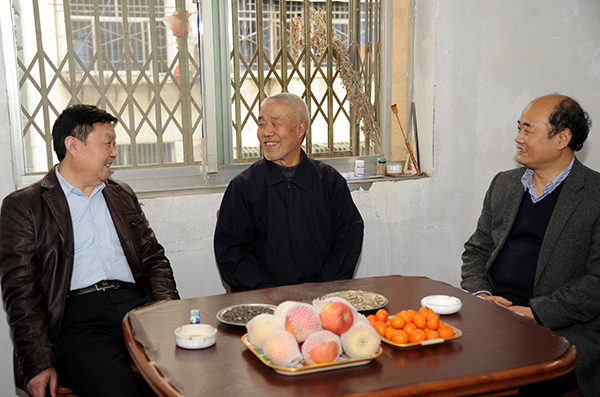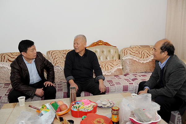 在學(xué)院辦公室負(fù)責(zé)人的陪同下,張景書(shū)、劉建林一行先后前往楊含榮、劉文斌家中,和他們促膝交談,關(guān)切地詢問(wèn)老同志的健康狀況和家庭、生活情況,叮囑他們保養(yǎng)好身體,為他們送上慰問(wèn)金和學(xué)校師生的祝福和問(wèn)候,并向老同志們介紹了學(xué)校一年來(lái)的發(fā)展建設(shè)成就。張景書(shū)、劉建林說(shuō),過(guò)去的一年里,學(xué)校各項(xiàng)工作取得了長(zhǎng)足進(jìn)步,這既是全體師生員工共同努力的結(jié)果,也離不開(kāi)老同志們打下的堅(jiān)實(shí)基礎(chǔ),離不開(kāi)老同志們的關(guān)心和支持。希望老同志們?cè)诒V厣眢w的同時(shí),一如既往地關(guān)注支持學(xué)院發(fā)展,積極建言獻(xiàn)策,常回學(xué)??纯?,為學(xué)校建設(shè)發(fā)展多提寶貴意見(jiàn)。