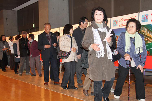 高山市當(dāng)?shù)孛癖娕抨?duì)入場(chǎng)觀看繪畫展開幕式