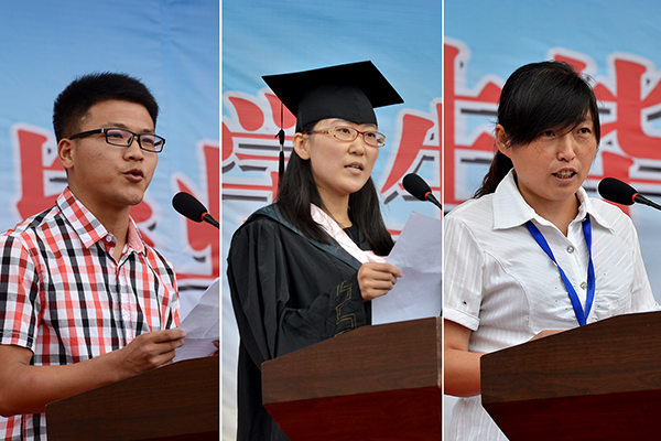 畢業(yè)生代表、經(jīng)濟與管理學(xué)院會計學(xué)專業(yè)2010級李真回憶了在校的四年光陰,對學(xué)校給自己帶來的種種收獲與感動表示真誠的感謝。生物醫(yī)藥與食品工程學(xué)院2011級學(xué)生劉淵代表在校生對畢業(yè)生送上了美好的祝愿,并代表全體在校生表達了勤勉學(xué)習(xí)的決心。