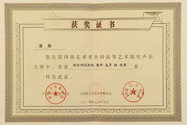 暑假期間,由中國聲樂家協(xié)會、云南省文學(xué)藝術(shù)界聯(lián)合會、云南藝術(shù)學(xué)院主辦的第四屆孔雀獎全國高等藝術(shù)學(xué)校聲樂大賽在云南藝術(shù)學(xué)院音樂學(xué)院舉辦。我校藝術(shù)學(xué)院潘勛等5名師生參加比賽并獲得四項(xiàng)獎勵。