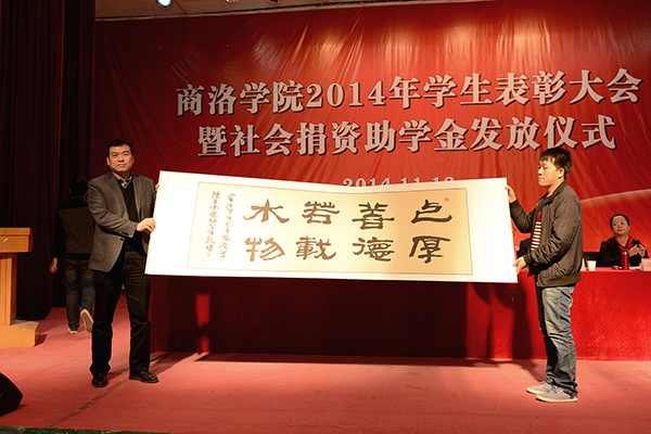 為了答謝4家企業(yè)對(duì)我校學(xué)生的無(wú)私資助,受助學(xué)生代表現(xiàn)場(chǎng)向商洛供電局、中國(guó)郵政商洛分公司、中國(guó)聯(lián)通商洛分公司和中國(guó)電信商洛分公司敬贈(zèng)了4幅自己創(chuàng)作的書(shū)畫(huà)作品。學(xué)生王聰、張思思分別代表受表彰的先進(jìn)個(gè)人和受資助學(xué)生作了大會(huì)發(fā)言。