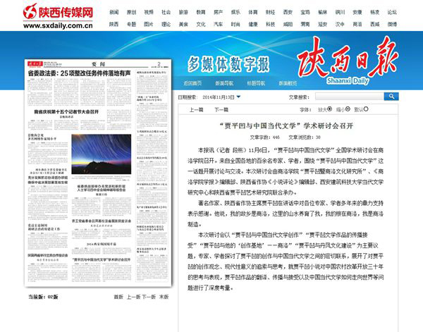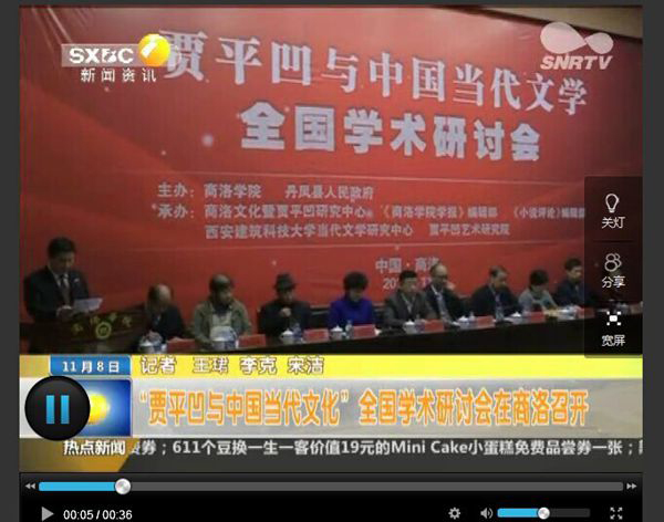 陜西廣播電視臺:11月8日陜西一套《第一新聞(午間播報)》欄目http://www.snrtv.com/content/2014-11/08/content_11808462.htm#(點擊該網(wǎng)絡(luò)鏈接,查找該頁面下方第13個新聞視頻《“賈平凹與中國當(dāng)代文化”全國學(xué)術(shù)研討會在商洛召開》)