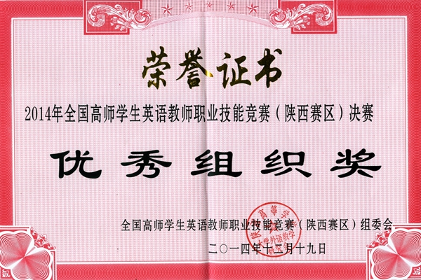 12月19日,2014年全國高師學(xué)生英語教師職業(yè)技能競賽(陜西賽區(qū))決賽在西安文理學(xué)院舉辦。來自全省十余所師范類高校英語專業(yè)的80余名學(xué)生參加了此次競賽。經(jīng)過激烈角逐,我校語言文化傳播學(xué)院英語系鄧林娟、鄭麗分別獲得二級、一級一等獎,張小琴、郭強強分別獲得二級、一級二等獎,我校被全國高師學(xué)生英語教師職業(yè)技能競賽(陜西賽區(qū))組委會授予優(yōu)秀組織獎。