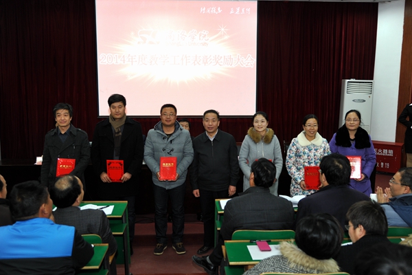 在熱烈的掌聲中,黨委書記張景書為省級本科教學工程項目授牌,校長劉建林、黨委副書記左曉民、紀委書記王思懷分別為2014年度教學技能競賽優(yōu)勝者、校級本科教學工程精品課程、校級教學名師、校級雙語教學示范課程、優(yōu)秀實習帶隊教師、優(yōu)秀教案及優(yōu)秀電子課件獲獎者頒發(fā)榮譽證書。左曉民宣讀了表彰決定。