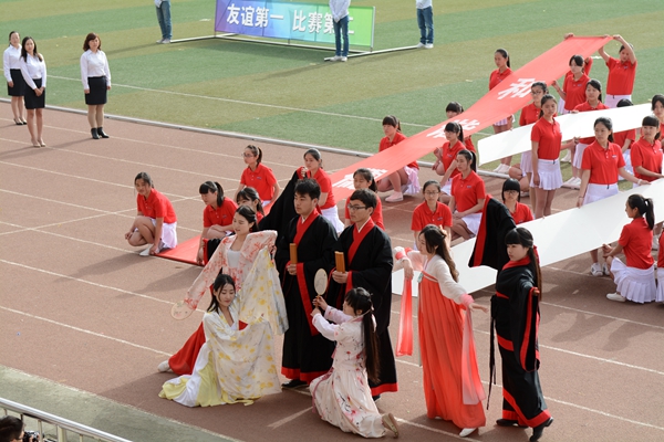 在歡快的運(yùn)動(dòng)會(huì)進(jìn)行曲中,各院和教職工代表等方隊(duì)精神飽滿,依次入場(chǎng)。他們昂首闊步,精神抖擻,整齊的陣容,嘹亮的口號(hào),颯爽的英姿,展示了當(dāng)代師生意氣風(fēng)發(fā)、朝氣蓬勃的青春風(fēng)采,博得了全場(chǎng)的陣陣掌聲。語(yǔ)言文化傳播學(xué)院擺出了漢字“文”的隊(duì)形,生物醫(yī)藥與食品工程學(xué)院用雙手組成“海鷗”圖形,城鄉(xiāng)規(guī)劃與建筑工程學(xué)院用五彩扇子組成“JGXY(建工學(xué)院)”、笑臉、“Go”三個(gè)圖案,其他各院也紛紛以多種多樣的形式展示了昂揚(yáng)的精神風(fēng)貌。