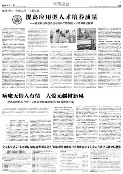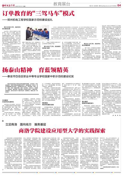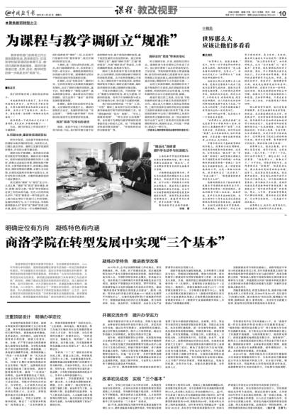 4月21日,《中國(guó)教育報(bào)》在第4版《教育展臺(tái)》專題版,刊發(fā)了校黨委書記張景書、校長(zhǎng)劉建林撰寫的文章《商洛學(xué)院建設(shè)應(yīng)用型大學(xué)的實(shí)踐探索》,專題報(bào)道了我校的辦學(xué)目標(biāo)與定位、建設(shè)應(yīng)用型大學(xué)的實(shí)踐與探索、辦學(xué)成果與辦學(xué)特色;4月22日,《中國(guó)教育報(bào)》在第10版《課程周刊》專題版,刊發(fā)了《商洛學(xué)院在轉(zhuǎn)型發(fā)展中實(shí)現(xiàn)“三個(gè)基本”》的專題文章,報(bào)道了我校在轉(zhuǎn)型時(shí)期教育教學(xué)改革的成果,備受社會(huì)關(guān)注。