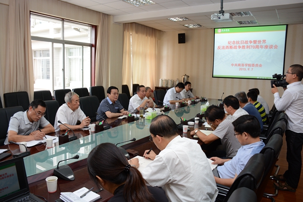 為了紀(jì)念抗日戰(zhàn)爭暨世界反法西斯戰(zhàn)爭勝利70周年,弘揚(yáng)偉大的抗戰(zhàn)精神,9月7日上午,我校舉辦了紀(jì)念抗日戰(zhàn)爭暨世界反法西斯戰(zhàn)爭勝利70周年座談會(huì)。會(huì)議以“銘記歷史 緬懷先烈 珍愛和平 開創(chuàng)未來”為主題。校黨委書記張景書、紀(jì)委書記王思懷,黨委委員、干部人事處處長高榮發(fā)出席會(huì)議。學(xué)校辦公室、干部人事處、宣傳部、紀(jì)委辦公室、工會(huì)、校團(tuán)委、學(xué)生處、保衛(wèi)處、文傳學(xué)院、人文學(xué)院、建工學(xué)院、數(shù)計(jì)學(xué)院等相關(guān)負(fù)責(zé)人,退休老教授代表,思政課教師代表,博士學(xué)位教師及學(xué)生代表參加了座談。座談會(huì)由王思懷主持。