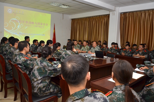 2015年9月9日,我校召開中國軍事戰(zhàn)略與國家安全主題座談會。解放軍西安政治學(xué)院軍事學(xué)系教授、2015級新生軍訓(xùn)團(tuán)團(tuán)長劉京生大校,軍訓(xùn)團(tuán)副團(tuán)長莊超中校,軍訓(xùn)團(tuán)副團(tuán)長伊明強(qiáng)少校出席本次活動。武裝部部長、軍訓(xùn)團(tuán)政委石啟英主持座談。