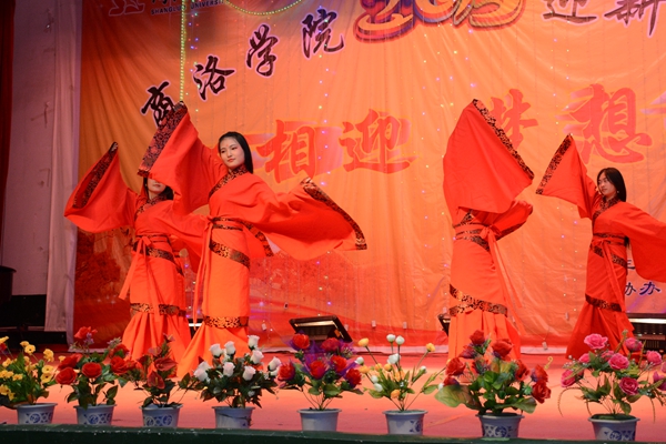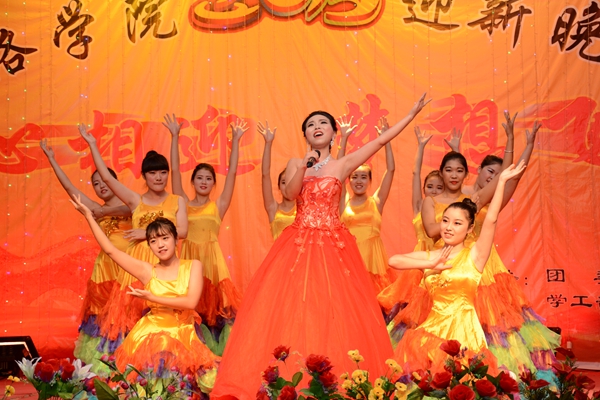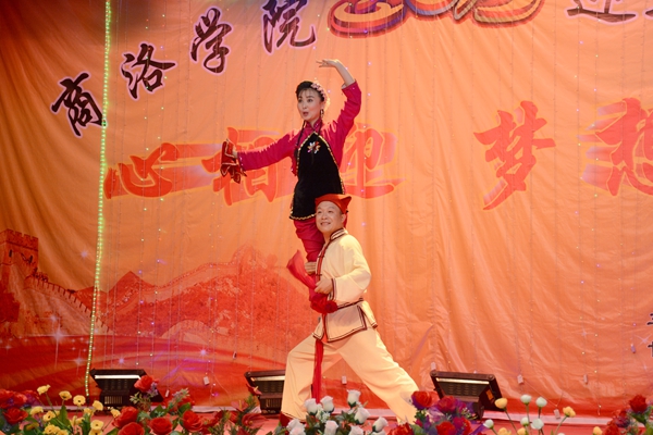 晚會以“心相迎 夢想飛”為主題。在大合唱《游擊隊(duì)隊(duì)歌》和校歌《正道直行做棟梁》的動人旋律唱中拉開帷幕。整場晚會形式多樣,現(xiàn)代與古典同臺,聲樂與器樂相和,浪漫與詼諧相伴。歌舞、相聲、朗誦、魔術(shù)、樂器聯(lián)奏等精彩的節(jié)目為觀眾呈現(xiàn)了豐盛的視聽盛宴。為紀(jì)念中國人民抗戰(zhàn)暨世界反法西斯戰(zhàn)爭勝利70周年,由藝術(shù)學(xué)院劉威老師帶來的《紅歌聯(lián)唱》將整場晚會渲染出了紅色的氣息,激昂的歌聲與清靈的鋼琴悠揚(yáng)的笛聲相宜相合贏得了一陣陣贊美與掌聲。城鄉(xiāng)規(guī)劃與建筑工程學(xué)院學(xué)生帶來的相聲《地理圖》用毫不遜色于銀幕相聲的精彩表演給整個(gè)會場帶來了不息笑聲與不絕的掌聲。由商洛劇團(tuán)的演員帶來的商洛花鼓戲《夫妻觀燈》表現(xiàn)了商洛本地戲曲的魅力,也預(yù)示了我校戲曲學(xué)院的蓬勃發(fā)展。最終,在一首《共筑中國夢》的師生歌伴舞中,整場晚會步入高潮,在陣陣掌聲中落下帷幕。