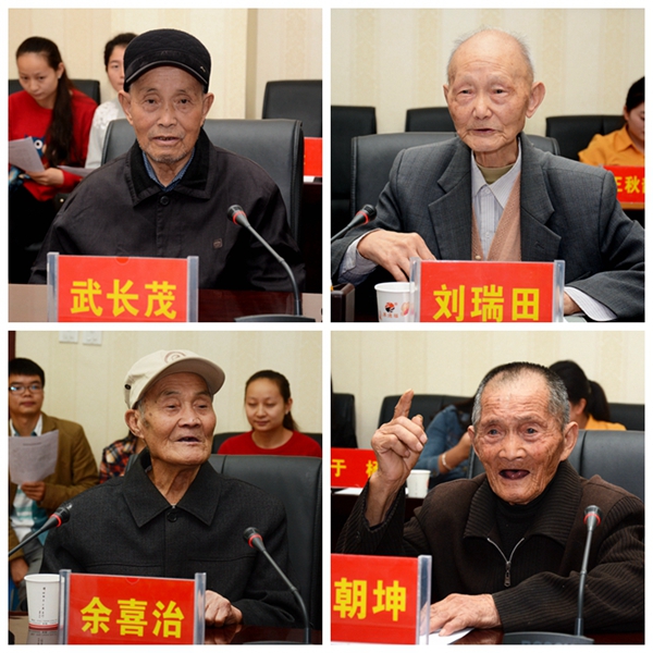 武長茂、劉瑞田、余喜治、程朝坤等4位抗戰(zhàn)老兵佩戴勛章現(xiàn)身我校,師生們目睹了英雄們的真容。他們都已過耄耋之年,其中武長茂老人還是坐著輪椅來到現(xiàn)場的,但老兵們依然精神矍鑠。余喜治老人用鏗鏘有力的聲音激動地講述了他的參戰(zhàn)經(jīng)歷:"我是1939年2月被拉的壯丁,被分在國民黨38軍,軍長是趙青山。到部隊(duì)后3個月我就上了前線,在日占區(qū)內(nèi)我親眼看到日軍燒殺搶掠,一場戰(zhàn)斗下來我們160多人就只剩下30多人。我們經(jīng)歷過戰(zhàn)爭的殘酷,希望現(xiàn)在全國人民團(tuán)結(jié)一心建設(shè)富強(qiáng)的祖國。"在回答心理學(xué)專業(yè)1301魏忠杰同學(xué)有關(guān)抗戰(zhàn)時期軍隊(duì)是如何訓(xùn)練的問題時,劉瑞田老人說,談不上什么訓(xùn)練,上午學(xué)文化,下午練瞄準(zhǔn),但因?yàn)槿鄙購椝?,自己在?xùn)練中沒有打過一槍。