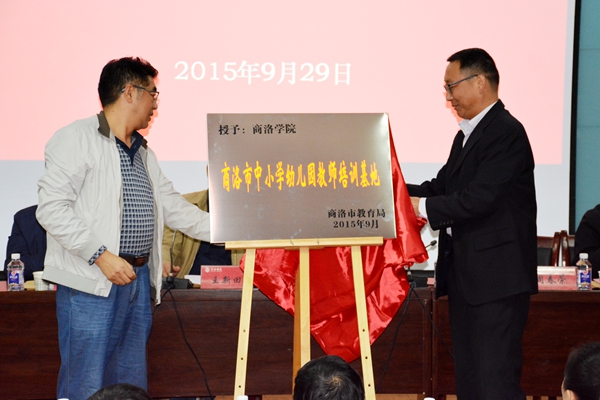 在熱烈的掌聲中,劉寶盈和周春榮分別代表我校和市教育局為“商洛市中小學幼兒園教師培訓基地”揭牌。