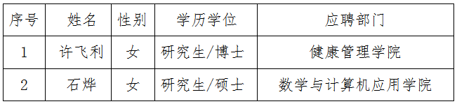 根據(jù)陜西省人社廳《關(guān)于陜西省事業(yè)單位公開(kāi)招聘人員辦法》規(guī)定及《商洛學(xué)院2020年人才招聘計(jì)劃》,經(jīng)過(guò)資格審查、試講、專(zhuān)家面試等環(huán)節(jié)考察,并經(jīng)院長(zhǎng)辦公會(huì)2020年9月17日研究,同意招聘許飛利等2位同志來(lái)我校工作,現(xiàn)予以公示。如有異議,請(qǐng)于2020年9月25日前向人事處或紀(jì)委辦公室反映。