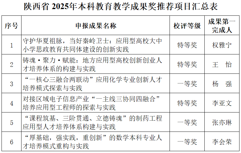 根據(jù)《關(guān)于開展2025年高等教育教學(xué)成果獎(jiǎng)評(píng)審工作的通知》(陜教函〔2025〕688號(hào))文件精神,我校認(rèn)真組織開展高等教育教學(xué)成果獎(jiǎng)申報(bào)工作,經(jīng)各教學(xué)單位推薦,校內(nèi)外專家評(píng)審,學(xué)校教學(xué)工作委員會(huì)審定,擬推薦《聚守護(hù)華夏祖脈,當(dāng)好生態(tài)衛(wèi)士:秦嶺腹地大中小學(xué)思想政治教育一體化建設(shè)的創(chuàng)新實(shí)踐》等6個(gè)項(xiàng)目(見下表)申報(bào)2025年陜西省高等教育教學(xué)成果獎(jiǎng),現(xiàn)予以公示。