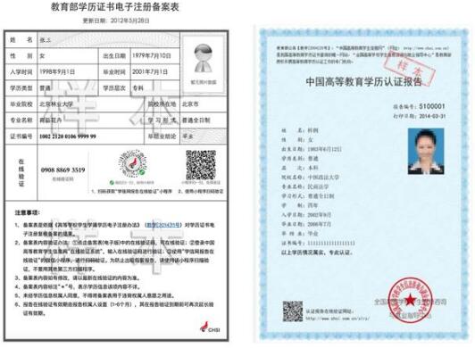 除上述對應類別應該提交的材料外,還須上傳教育部留學服務(wù)中心出具的《國外學歷學位認證書》原件。示范照片如下: