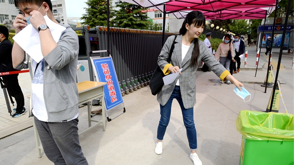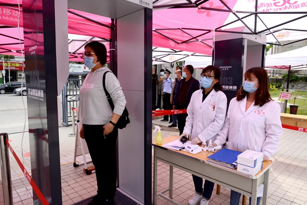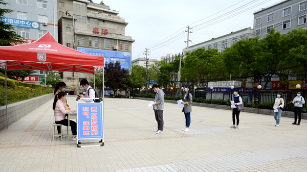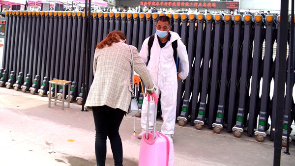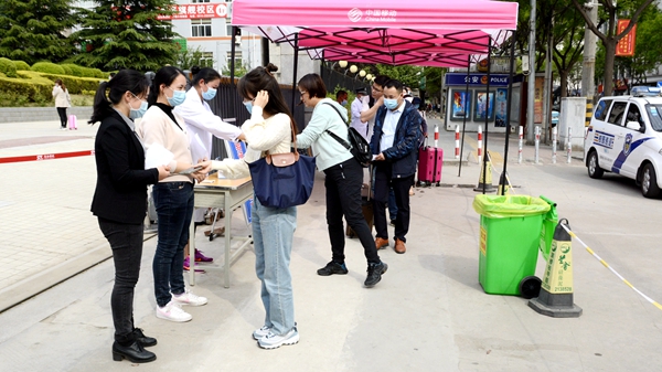隨著龍治剛“演練開(kāi)始”一聲令下,緊張有序的演練正式拉開(kāi)帷幕,幾十余名“學(xué)生”在學(xué)校大門(mén)口外保持1.5米間隔依次進(jìn)入消毒通道,卸下舊口罩投棄到專(zhuān)用垃圾箱后佩戴工作人員配發(fā)的一次性醫(yī)用口罩,經(jīng)工作人員查驗(yàn)有效證件后進(jìn)入校門(mén)口自動(dòng)測(cè)溫門(mén),進(jìn)行第一次體溫檢測(cè)。體溫檢測(cè)正常的學(xué)生按照指示線到一號(hào)教學(xué)樓前的各學(xué)院接待點(diǎn)接受二次體溫檢測(cè)、掃描驗(yàn)證健康二維碼、填寫(xiě)健康承諾書(shū)。