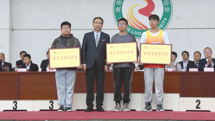 在熱烈的掌聲中,黨委書(shū)記龍治剛為獲得體育道德風(fēng)尚獎(jiǎng)的團(tuán)體頒獎(jiǎng),校長(zhǎng)范新會(huì)為男女團(tuán)體總分前三名頒獎(jiǎng),副校長(zhǎng)郭瑾為男子及女子團(tuán)體總分前三名頒獎(jiǎng)。