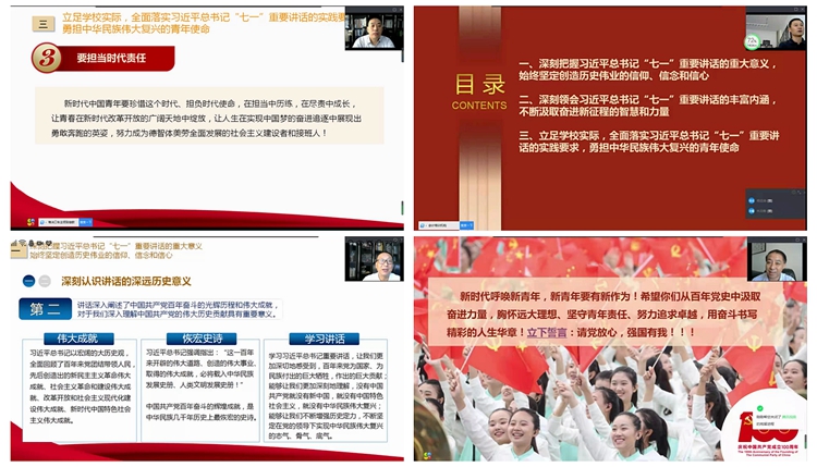 校領(lǐng)導(dǎo)的授課主題鮮明、內(nèi)容豐富、深入淺出、各具特色,既有理論高度,又有思想深度,并靈活引用了《習(xí)近平講故事》和《習(xí)近平用典》中的鮮活事例,分析透徹、引人入勝,對(duì)廣大師生深入學(xué)習(xí)貫徹習(xí)近平總書(shū)記“七一”重要講話精神具有很強(qiáng)的指導(dǎo)性。授課期間,廣大學(xué)生紛紛通過(guò)在線平臺(tái)為校領(lǐng)導(dǎo)點(diǎn)贊,并在留言中踴躍抒發(fā)自己加強(qiáng)黨史學(xué)習(xí)、立志成才、勇?lián)褡鍙?fù)興大任的信心和決心。