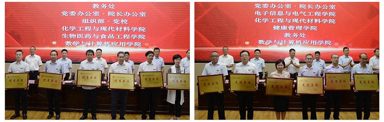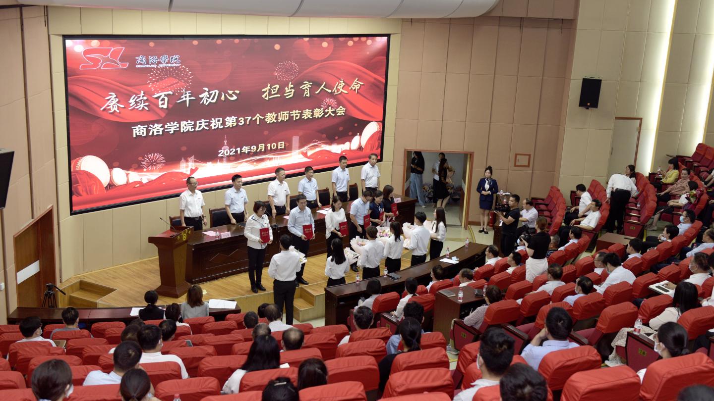 大會對我校2021年先進集體、2020年度目標責任考核先進單位,榮獲陜西省教學名師、2020年度陜西省崗位學雷鋒標兵、2021年7—8月敬業(yè)奉獻類陜西好人的教師,及我校2021年優(yōu)秀教師、2021年優(yōu)秀教育工作者、“我最喜愛的老師”、學生工作、科技工作及教學工作榮譽獲得者進行了表彰。伴隨著輕松歡快的背景音樂和電子屏幕不斷滾動著的表彰名單,受表彰的集體和個人代表邁著矯健的步伐先后走上主席臺,從校領導手中接過獎牌和榮譽證書。校領導與受表彰的教師們親切握手、合影留念。學生代表上臺為受表彰的教師們送上鮮花和誠摯的祝福,感謝老師們的教育之恩和培育之情。