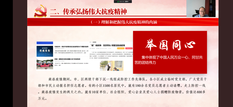 校長范新會(huì)在講授中引用多個(gè)鮮活事例,生動(dòng)形象地闡述了生命至上、舉國同心、舍生忘死、尊重科學(xué)、命運(yùn)與共的偉大抗疫精神內(nèi)涵,系統(tǒng)性總結(jié)了中國戰(zhàn)“疫”取得的偉大成就。結(jié)合近期國內(nèi)、我省和商州區(qū)等疫情防控形勢(shì),范新會(huì)強(qiáng)調(diào),青年學(xué)生要深刻理解和傳承弘揚(yáng)偉大抗疫精神,把握偉大抗疫精神的內(nèi)涵。一是要肩負(fù)使命擔(dān)當(dāng),與祖國和人民同呼吸共命運(yùn)。青年學(xué)生要把學(xué)問做在祖國大地上,做接地氣的真學(xué)問,要到祖國和人民最需要的地方去摸爬滾打,在疫情防控、科技創(chuàng)新、鄉(xiāng)村振興中發(fā)光發(fā)熱,從中找到人生真諦、生命價(jià)值和事業(yè)方向。二是要厚植愛國情懷,做積極戰(zhàn)“疫”的先行者。青年學(xué)生要帶頭遵守疫情防控各項(xiàng)要求,主動(dòng)傳播疫情防控權(quán)威信息,分享正能量抗疫故事,解讀疫情防控方針政策。要敢于挺身而出,發(fā)揮所長、盡己所能為防控工作助力。要服從組織安排,落實(shí)安全防護(hù),規(guī)范有序參與疫情防控志愿服務(wù),在筑牢校園、社區(qū)防疫屏障中,展現(xiàn)商洛學(xué)院人應(yīng)有的昂揚(yáng)斗志和青春力量。