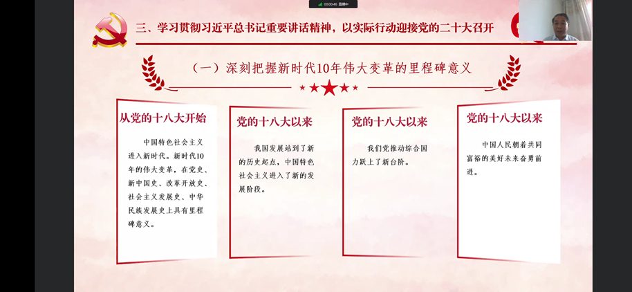 張志昌強(qiáng)調(diào),黨的二十大即將于10月份召開,這是在進(jìn)入全面建設(shè)社會(huì)主義現(xiàn)代化國家新征程的關(guān)鍵時(shí)刻召開的一次十分重要的大會(huì),將科學(xué)謀劃未來5年乃至更長時(shí)期黨和國家事業(yè)發(fā)展的目標(biāo)任務(wù)和大政方針,事關(guān)黨和國家事業(yè)繼往開來,事關(guān)中國特色社會(huì)主義前途命運(yùn),事關(guān)中華民族偉大復(fù)興。作為青年學(xué)生,一是要堅(jiān)定理想信念,主動(dòng)“扣好人生的第一??圩印?,自覺做社會(huì)主義核心價(jià)值觀的堅(jiān)定信仰者、積極傳播者、模范踐行者,堅(jiān)決聽黨指揮跟黨走,把對(duì)黨忠誠、對(duì)人民的熱愛始終牢記在心中、落實(shí)到行動(dòng)中。二是要強(qiáng)化理論武裝,及時(shí)跟進(jìn)學(xué)習(xí),始終在政治立場(chǎng)、政治方向、政治原則、政治道路上同以習(xí)近平同志為核心的黨中央保持高度一致,堅(jiān)定不移沿著習(xí)近平總書記指引的道路奮勇前進(jìn)。三是要增強(qiáng)實(shí)踐本領(lǐng),堅(jiān)持學(xué)以致用,積極參加創(chuàng)新創(chuàng)業(yè)實(shí)踐,拓寬學(xué)習(xí)領(lǐng)域、優(yōu)化知識(shí)結(jié)構(gòu),培養(yǎng)創(chuàng)新意識(shí)、提高創(chuàng)新能力。