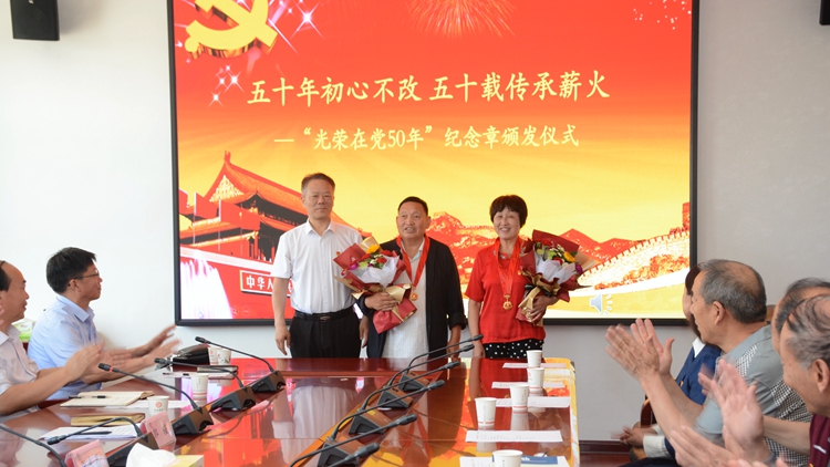 為進(jìn)一步增強(qiáng)老黨員的榮譽(yù)感、歸屬感,張志昌代表學(xué)校黨委向黨齡50周年的老黨員代表陳淑芳、陳守榮頒發(fā)“光榮在黨50年”紀(jì)念章,并送上鮮花和祝福,充分肯定和感謝老黨員為學(xué)校發(fā)展作出的突出貢獻(xiàn)。