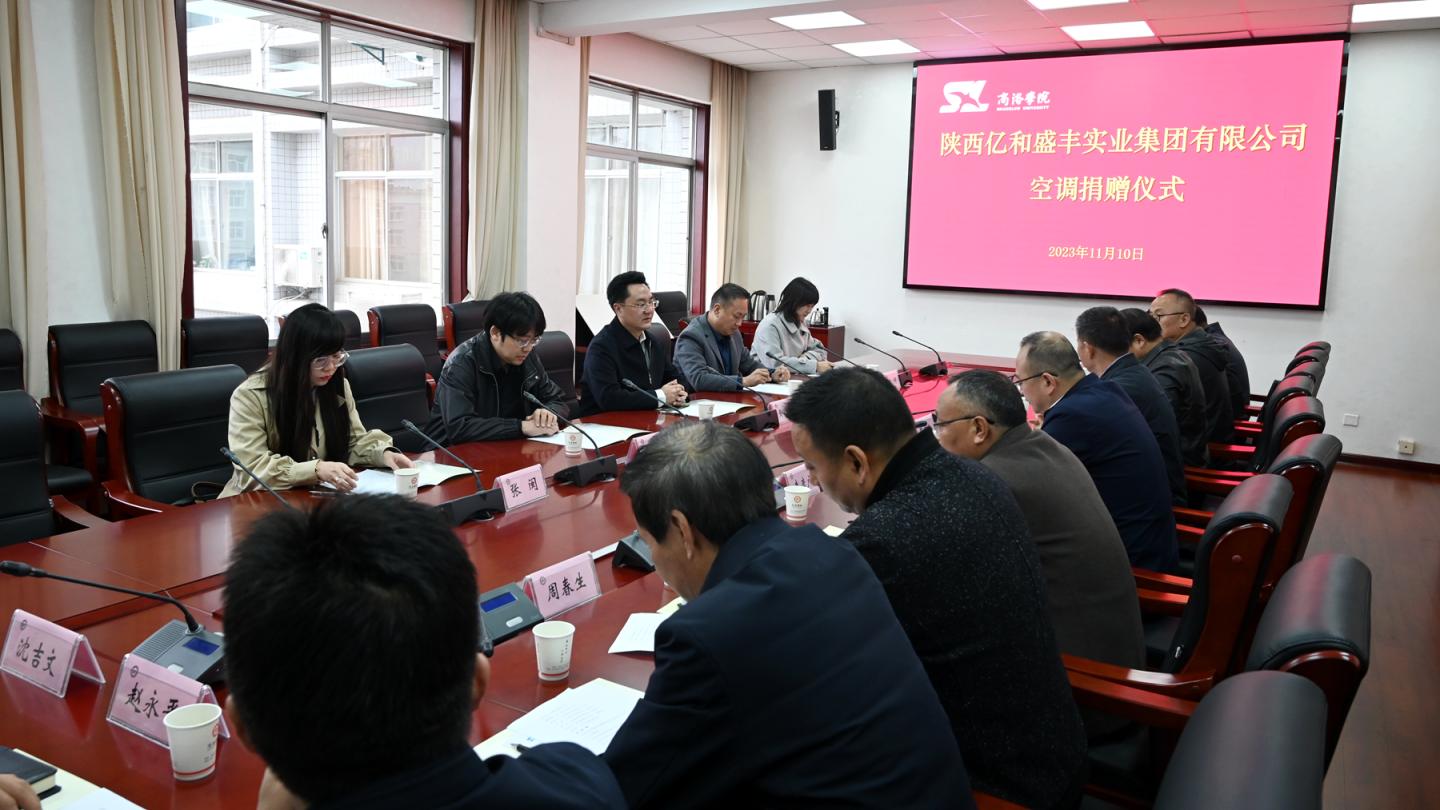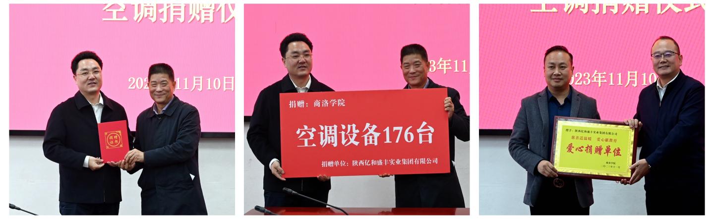 為進一步改善學校辦學條件,經(jīng)友好協(xié)商,陜西億和盛豐實業(yè)集團有限公司向我校丹江校區(qū)學生公寓樓C棟捐贈價值60余萬元的176臺空調(diào)設(shè)備。11月10日,我校舉辦空調(diào)設(shè)備捐贈儀式。陜西億和盛豐實業(yè)集團有限公司董事局主席黃鵬、董事長黃濤出席捐贈儀式。校長范新會代表學校接受捐贈并向陜西億和盛豐實業(yè)集團有限公司頒發(fā)捐贈證書。副校長郭瑾主持捐贈儀式并向企業(yè)頒發(fā)捐贈牌匾。