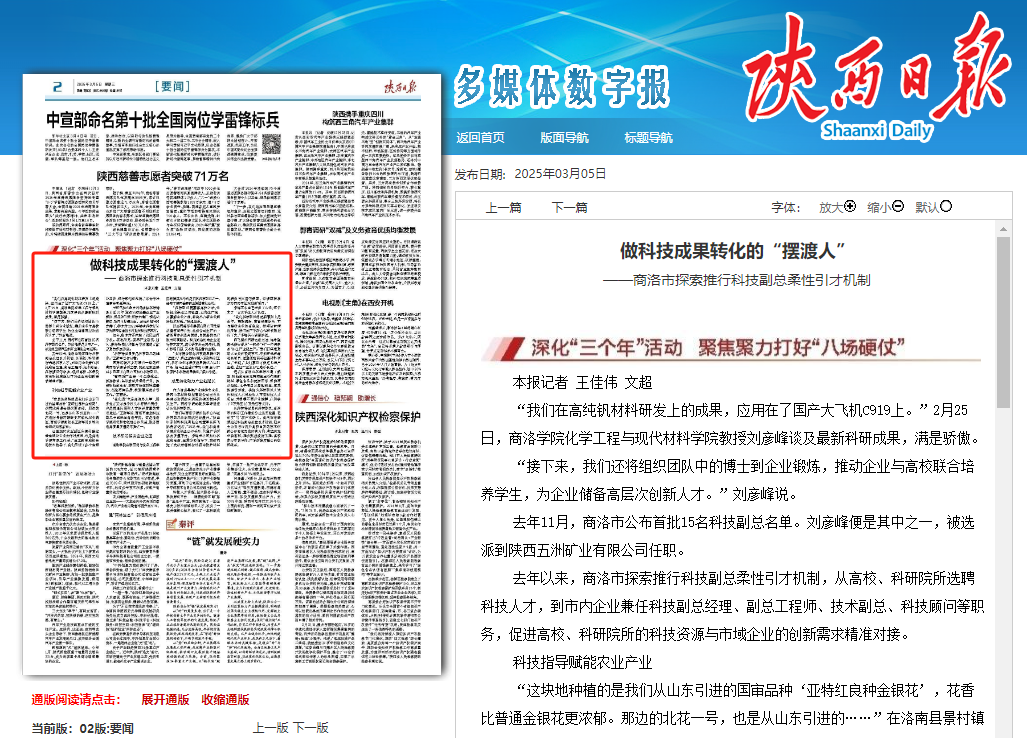 日前,《陜西日報》2版要聞欄目,以《做科技成果轉(zhuǎn)化的“擺渡人”》為題,專題報道介紹了商洛學院科研工作者把論文“寫”在商洛市“一都四區(qū)”建設(shè)產(chǎn)業(yè)鏈上的做法和經(jīng)驗。