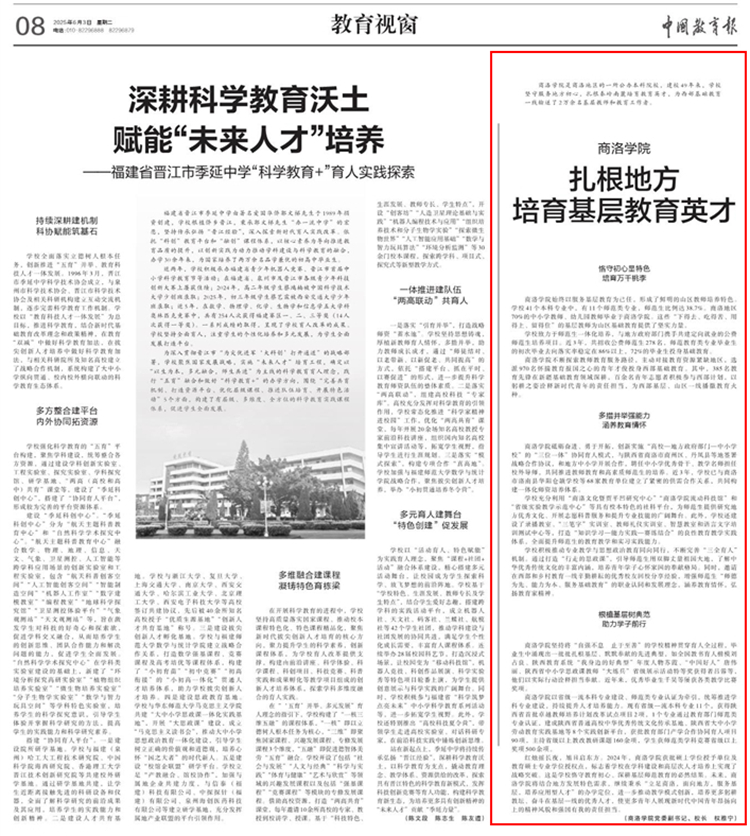 6月3日,《中國(guó)教育報(bào)》“教育視窗”欄目刊發(fā)了校長(zhǎng)權(quán)雅寧署名文章《商洛學(xué)院扎根地方培育基層教育英才》,對(duì)我校扎根秦嶺培育教育人才的經(jīng)驗(yàn)成果進(jìn)行了專題報(bào)道。