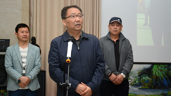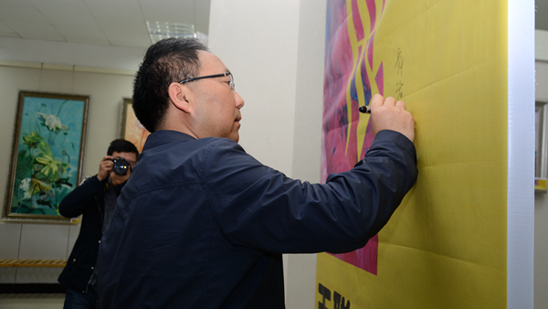 龍治剛在畫展開幕式上作了講話,要求藝術(shù)學(xué)院師生進(jìn)一步凝練秦嶺畫派創(chuàng)作方向,不斷創(chuàng)作藝術(shù)精品,擴(kuò)大秦嶺畫派和教師的社會(huì)影響。在藝術(shù)學(xué)院負(fù)責(zé)人和王聰指導(dǎo)教師的陪同下,他興致勃勃地參觀了王聰?shù)淖髌?,了解了王聰?shù)膶W(xué)習(xí)創(chuàng)作情況,針對(duì)具體作品進(jìn)行了點(diǎn)評(píng),并親筆簽名留念。