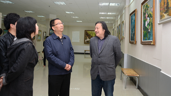 4月17日,藝術(shù)學(xué)院美術(shù)專業(yè)學(xué)生王聰“我心我塑” 畢業(yè)油畫展在藝術(shù)展廳拉開帷幕,校黨委書記龍治剛參觀了畫展。龍治剛在參觀中對(duì)王聰?shù)膭?chuàng)作水平給予了肯定,并勉勵(lì)他抓住重點(diǎn),大膽突破,創(chuàng)作出更好的作品。