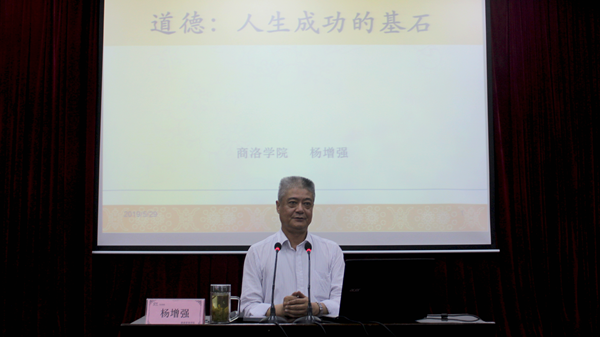 本期道德講堂由唱道德歌曲、誦道德經(jīng)典、學(xué)道德模范、聽道德報(bào)告四個(gè)環(huán)節(jié)組成。活動(dòng)在悠揚(yáng)的《公民道德歌》中拉開帷幕,隨后,在健康管理學(xué)院教師李夢姣的帶領(lǐng)下,社會1801班全體學(xué)生誦讀了《弟子規(guī)·信》中的片段,深情詮釋了道德經(jīng)典的魅力,贏得了陣陣掌聲。接著,現(xiàn)場人員共同觀看了陜西省第五屆道德模范、孝老愛親類“中國好人”唐偉麗的感人事跡短片?;顒?dòng)還邀請我校圖書館館長楊增強(qiáng)教授以“道德:人生成功的基石”為題作了專題報(bào)告,報(bào)告指出,當(dāng)代大學(xué)生應(yīng)牢固樹立社會主義核心價(jià)值觀,堅(jiān)持誠實(shí)守信的人生信條,把誠信融入到學(xué)習(xí)生活的方方面面。