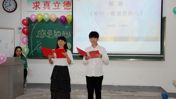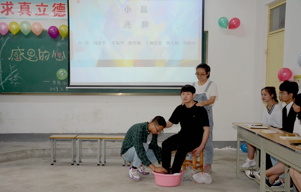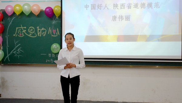 班會中,師生以小品《洗腳》、朗誦《常懷一顆感恩的心》、“我想對你說”“說出你的愛”等多種形式詮釋了親情和師恩的涵義,教育引導(dǎo)大家要知恩、感恩,以實(shí)際行動回報關(guān)心支持自己的父母、老師和學(xué)校。中國好人、陜西省道德模范學(xué)生唐偉麗傾情講述了自己的感人事跡,分享了自己的成長感悟,鼓勵大家珍惜大好年華、努力學(xué)習(xí)進(jìn)步。