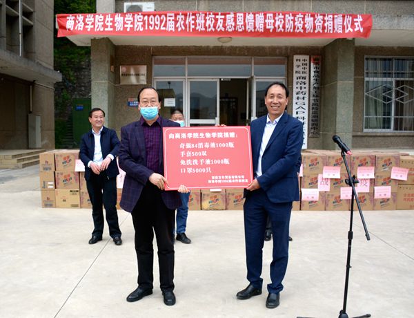 4月22日,我校生物學(xué)院92屆校友向母校捐贈(zèng)價(jià)值10萬(wàn)元的防疫物資。校長(zhǎng)范新會(huì),副校長(zhǎng)王新軍,校友代表、洛南縣委副書記馬建琦及西安方爾貿(mào)易有限公司總經(jīng)理林建軍出席在學(xué)校舉行的捐贈(zèng)儀式。院長(zhǎng)辦公室、生物學(xué)院負(fù)責(zé)人,教師代表,生物學(xué)院農(nóng)作班92屆部分校友參加捐贈(zèng)儀式。