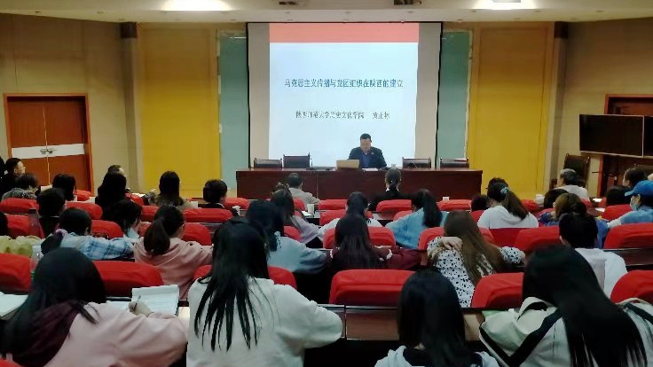 4月28日下午,馬克思主義學院在圖書館一樓報告廳舉辦黨史學習教育專題報告會。特邀陜西師范大學歷史文化學院教授、博士生導師黃正林為師生作了主題為“馬克思主義傳播與陜西黨團組織的建立”的學術報告會。報告會由馬克思主義學院院長蔣正治主持。