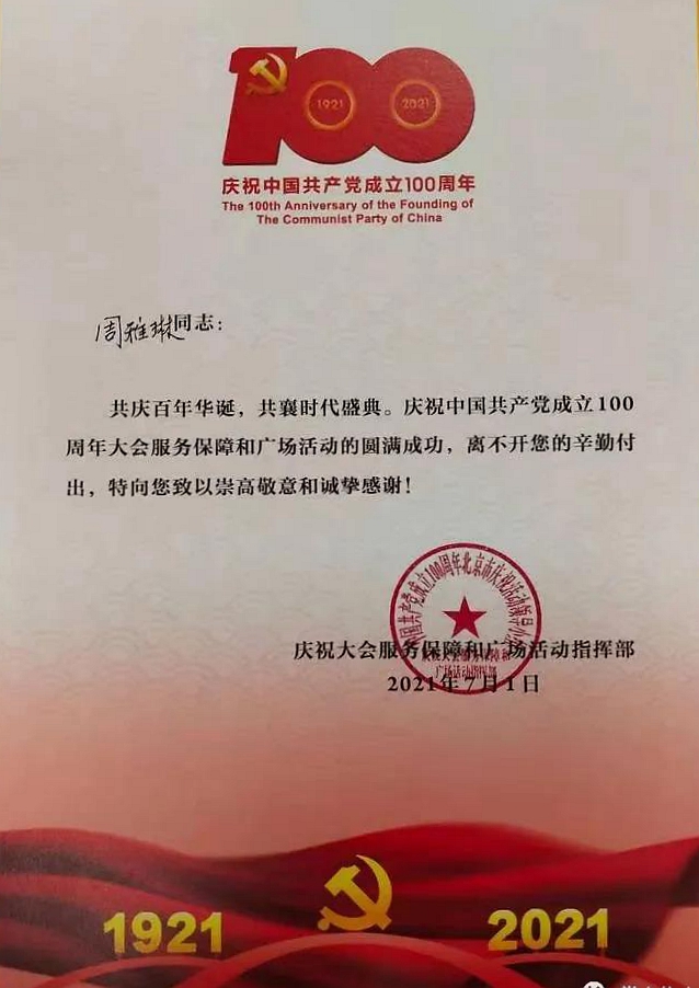 今年3月份,周雅琳上報了個人演奏視頻,通過了上級預(yù)選,4月下旬來到北京參加集訓(xùn)。訓(xùn)練期間,她始終以最高標準來嚴格要求自己,每天早起練基本功,吹長音,晚上加班加點唱譜。經(jīng)過她的不懈努力與刻苦訓(xùn)練,終于,在7月1日當(dāng)天,她與聯(lián)合軍樂團的戰(zhàn)友們一起,站在祖國的心臟---天安門廣場,奏響激情澎湃的樂章,為大會增添動人的華彩,也為商洛和學(xué)校爭得了榮譽,充分展示了我校學(xué)子昂揚向上的精神風(fēng)貌。