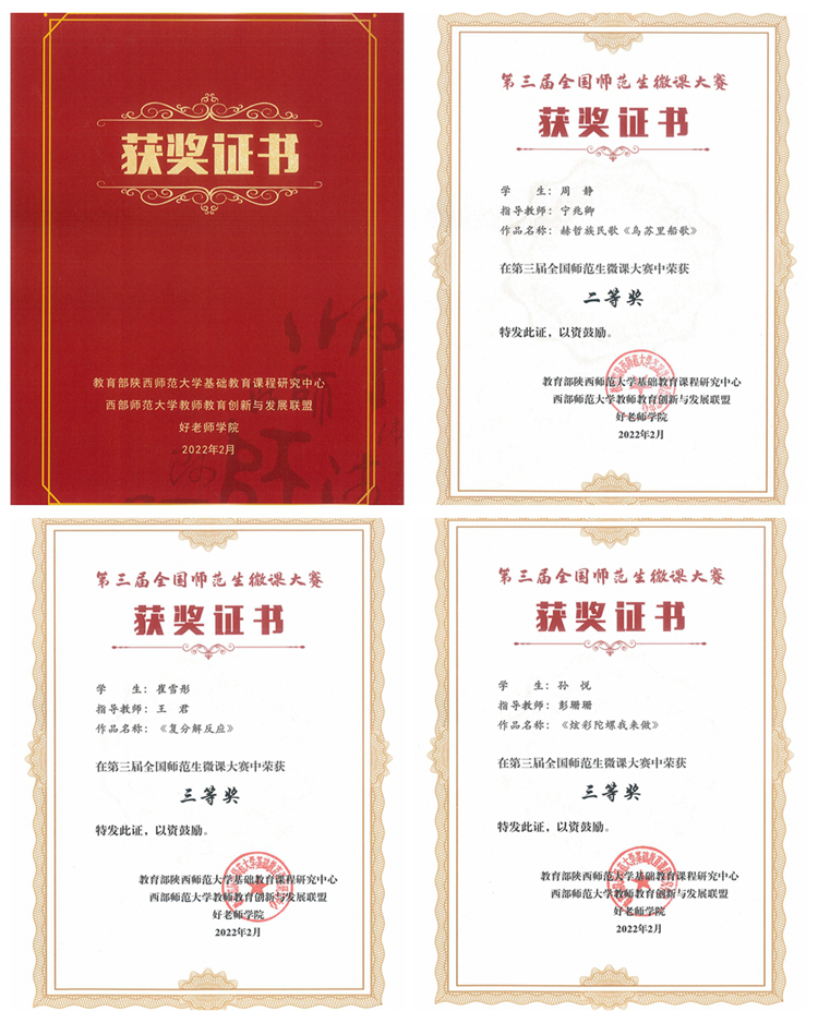 近日,第三屆全國師范生微課大賽結果公布。由我校教師寧兆卿指導、音樂學專業(yè)學生周靜完成的作品《赫哲族民歌<烏蘇里船歌>》榮獲二等獎,教師王君指導、化材學院學生崔雪彤完成的《復分解反應》以及教師彭珊珊指導、學前教育學專業(yè)學生孫悅完成的《炫彩陀螺我來做》獲三等獎。