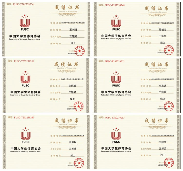 近日,由中國(guó)大學(xué)生體育協(xié)會(huì)主辦,中國(guó)大學(xué)生體育協(xié)會(huì)跆拳道分會(huì)執(zhí)行,中國(guó)地質(zhì)大學(xué)(北京)承辦的2022年中國(guó)大學(xué)生跆拳道舞線上賽圓滿落幕。經(jīng)過(guò)與來(lái)自廈門(mén)大學(xué)、北京交通大學(xué)、中國(guó)地質(zhì)大學(xué)、西安電子科技大學(xué)、成都體育學(xué)院等全國(guó)47所高校,54支代表隊(duì)激烈比拼,我校獲三等獎(jiǎng)。