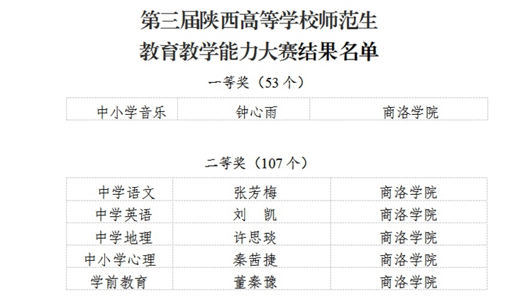 近日,陜西省教育廳公布了第三屆陜西高等學校師范生教育教學能力大賽獲獎名單,我校喜獲一等獎1項,二等獎5項。