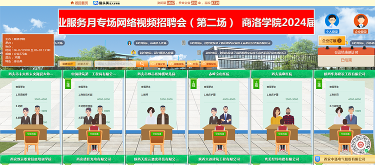 為充分落實(shí)2024屆畢業(yè)生就業(yè)“百日沖刺”行動(dòng)方案,全面促進(jìn)2024屆畢業(yè)生更加充分、更高質(zhì)量就業(yè),6月7日,我校依托貓頭鷹云就業(yè)平臺(tái)舉辦2024屆畢業(yè)生春季綜合類暨民營企業(yè)服務(wù)月專場網(wǎng)絡(luò)視頻招聘會(huì)(第二場)。通過搭建“互聯(lián)網(wǎng)+視聘”線上平臺(tái),精準(zhǔn)對接畢業(yè)生求職需求,促進(jìn)畢業(yè)生實(shí)現(xiàn)更高質(zhì)量、更加充分就業(yè)。本次招聘會(huì)由省教育廳、省就業(yè)留學(xué)中心指導(dǎo),我校和商洛市人社局主辦,我校就業(yè)中心和商洛市人才中心承辦。