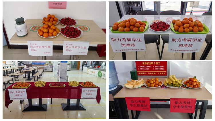 各學(xué)生食堂設(shè)立“考研加油站”,為考研學(xué)生免費提供各類水果,冬至當天,教工食堂為研究生招生考試考務(wù)人員及工作人員提供了手工水餃。