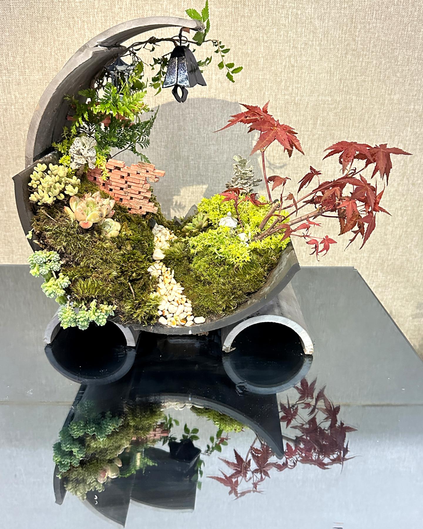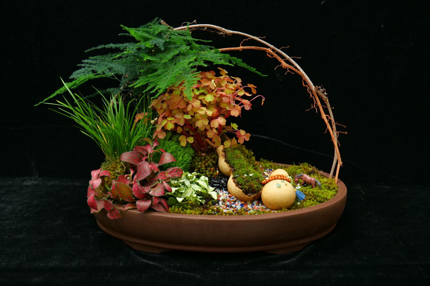 本次大賽以“以花會友,以友養(yǎng)情”為主題,聚焦大學生花藝創(chuàng)新與實踐能力培養(yǎng),吸引了省內(nèi)多所院校的600余名選手報名參賽。我校生物學院園林專業(yè)葛京玉等學生的花藝作品《瓦音青瀾》,寓意舊物之音與青春活力的交融,給評委們留下了深刻印象,在大賽中獲得組合盆栽組一等獎。彭點等學生的花藝作品《苔影竹紋·福聚清祿》,從中國傳統(tǒng)文化中汲取靈感,用設(shè)計傳遞美好寓意,獲得組合盆栽組三等獎。此外,李桐、楊昕萌、周昱伶等學生的作品《千帆競渡,枯木煥新,粽香致遠》《皎羽逐光,夢綻華裳》《玫影鶴吟處》分別獲得插花組優(yōu)秀獎,學生趙華華的作品《綺夢鳶舞》獲得壓花畫組優(yōu)秀獎。