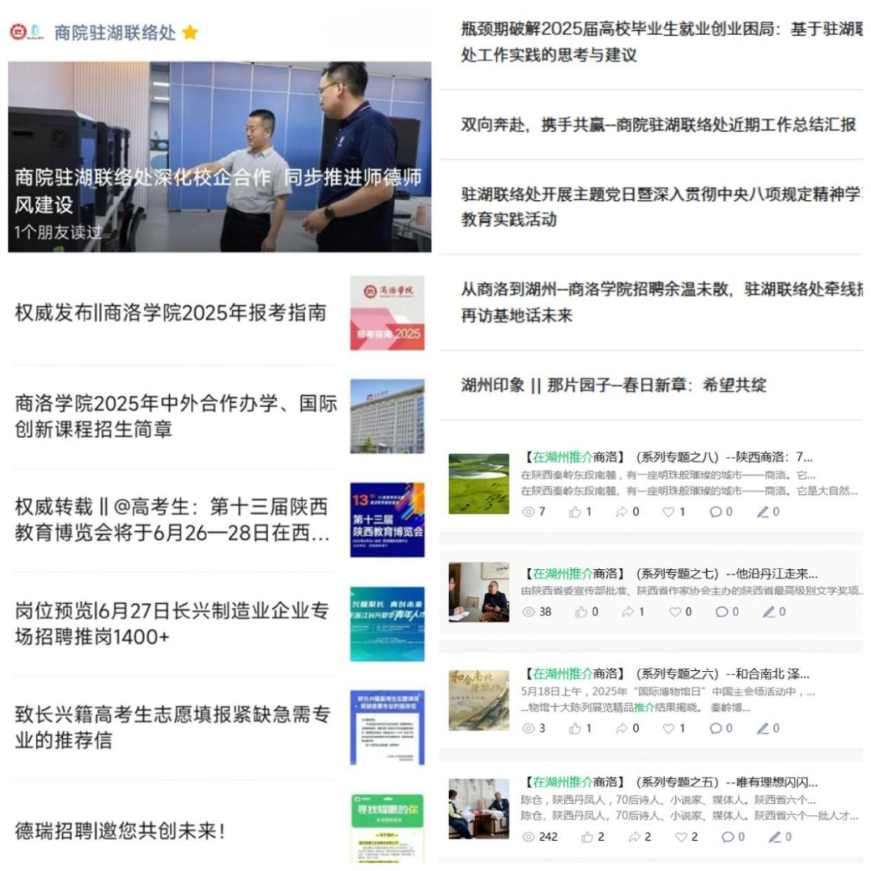 講好商院故事,提升社會影響力。通過“商院駐湖聯(lián)絡處”公眾號發(fā)布聯(lián)絡處工作動態(tài)、階段性工作總結、學校重點新聞、就業(yè)政策解讀、企業(yè)招聘動態(tài)等內(nèi)容260余篇。其中,發(fā)布“在湖州推介商洛”系列內(nèi)容8篇,發(fā)表《商洛學院駐湖州就業(yè)人才工作聯(lián)絡處積極開展系列活動》《雙向奔赴,攜手共贏--商院駐湖聯(lián)絡處近期工作總結匯報》《湖州·商洛學院:共譜雙向奔赴之華章》等總結綜述性文章6篇,構筑起“信息集散地”與“校地交流窗口”的雙向樞紐,既主動向外展示學校形象、聯(lián)絡處成果與商洛特色,亦向內(nèi)傳遞湖州產(chǎn)業(yè)生態(tài)、就業(yè)趨勢與政策紅利。
