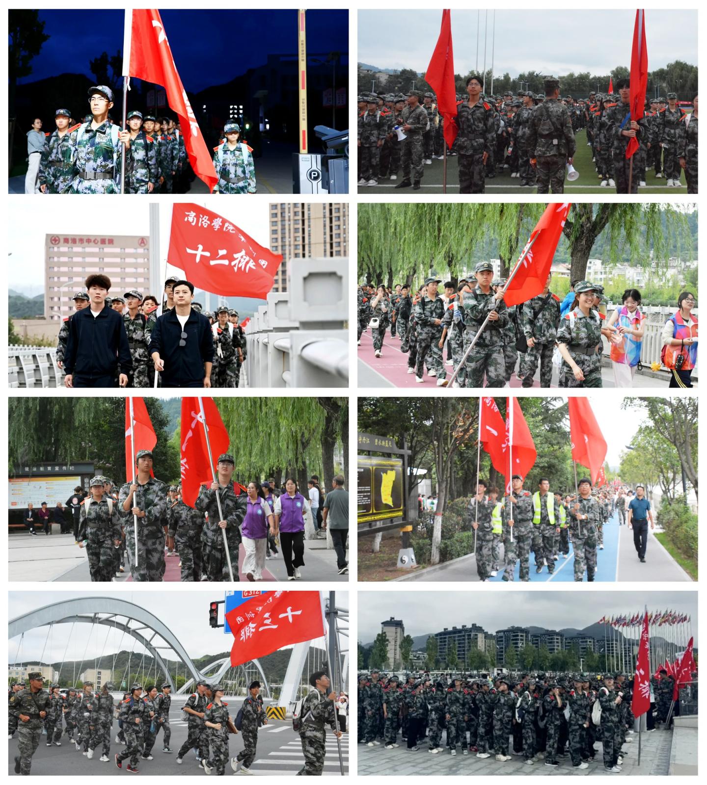 清晨5時(shí)30分,丹江校區(qū)參訓(xùn)新生率先集合,6時(shí)整準(zhǔn)時(shí)出發(fā);北新街校區(qū)新生于6時(shí)30分自體育場整隊(duì)啟程。兩隊(duì)沿預(yù)定路線行進(jìn),于帆船公園順利匯合。匯合后,全體新生沿丹江河堤路繼續(xù)行進(jìn),途經(jīng)望江樓、商洛市人民政府,最終抵達(dá)秦嶺博物館北側(cè)廣場,全程約15公里。全體新生行軍過程秩序井然、步伐整齊,展現(xiàn)出了良好的軍事素養(yǎng)和吃苦耐勞的精神風(fēng)貌。