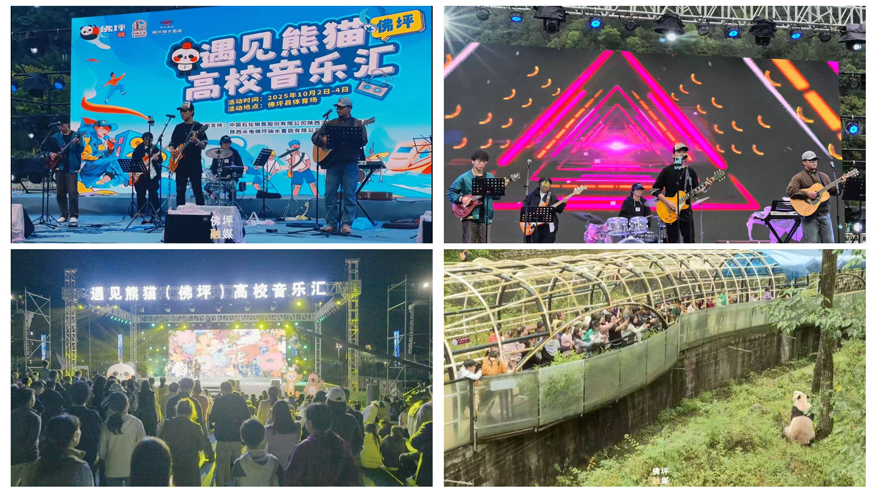 在高校音樂匯環(huán)節(jié),我校大藝團“夢影樂隊”傾情演繹了《流行》《私奔》《活著》《茶底世界》等多首歌曲。同學(xué)們憑借扎實的專業(yè)技能和飽滿的舞臺表現(xiàn)力,充分展現(xiàn)了高校學(xué)子積極向上的精神風(fēng)貌,也將現(xiàn)代音樂文化與佛坪獨特的熊貓IP、自然人文景觀有機融合,為現(xiàn)場觀眾帶來一場視聽盛宴,成為“文旅+音樂”跨界融合的生動實踐。