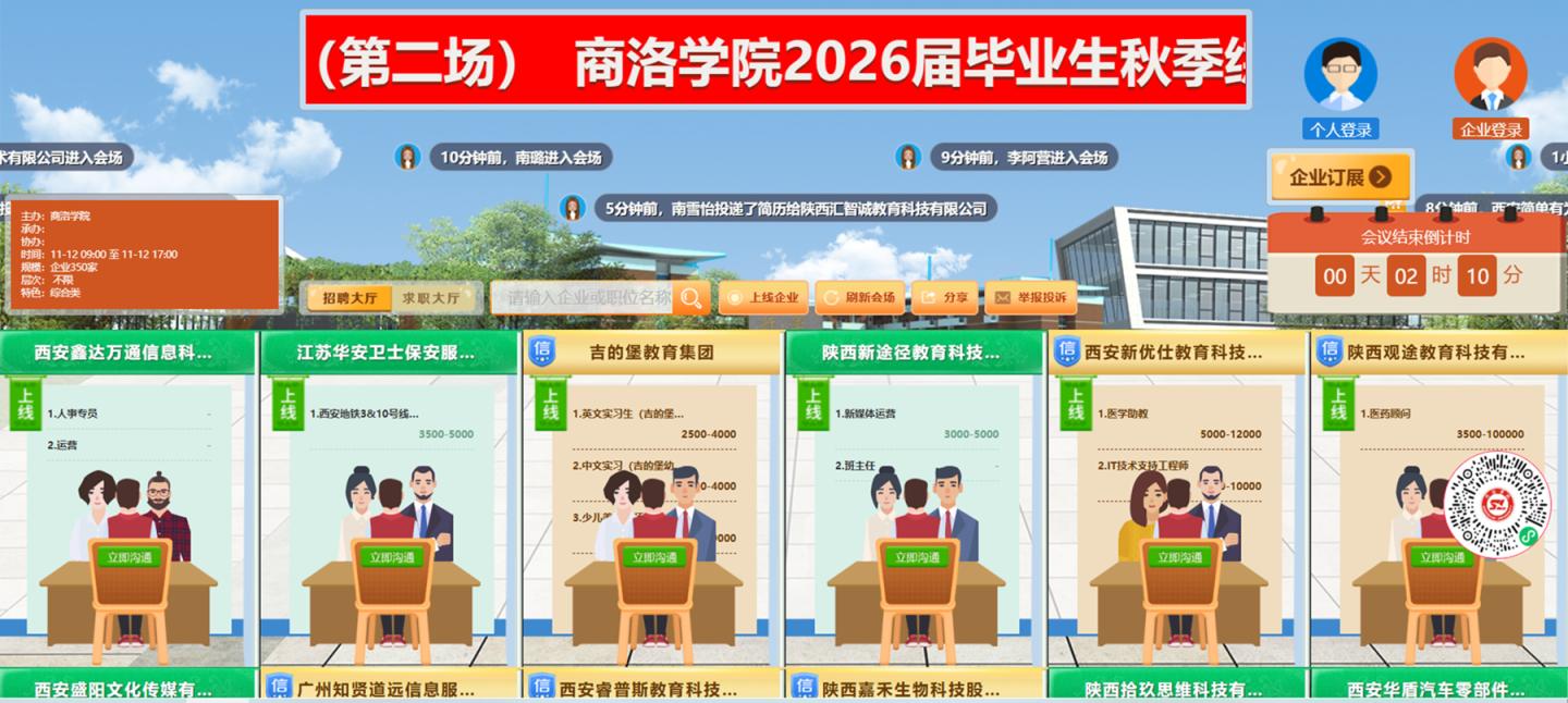 11月12日,我校舉辦2026屆畢業(yè)生秋季綜合類暨“職引未來(lái)”全國(guó)城市聯(lián)合招聘高校畢業(yè)生校園專場(chǎng)網(wǎng)絡(luò)視頻招聘會(huì)(第二場(chǎng))。招聘會(huì)共邀請(qǐng)華羿微電子股份有限公司、陜西美邦藥業(yè)集團(tuán)股份有限公司、西安環(huán)海機(jī)器人科技有限公司等220余家優(yōu)質(zhì)用人單位云端匯聚,為畢業(yè)生精準(zhǔn)提供有效就業(yè)崗位4630余個(gè)。